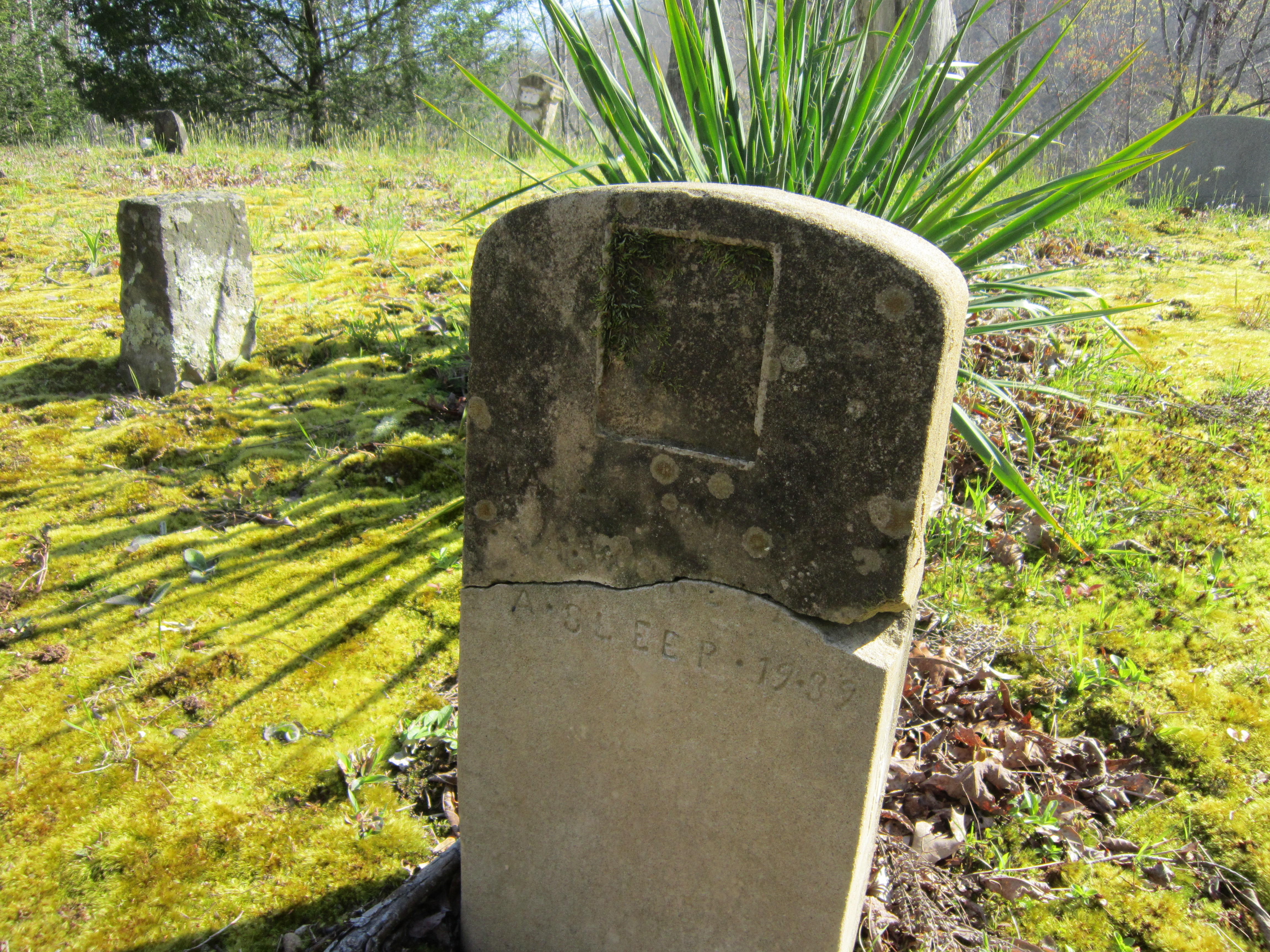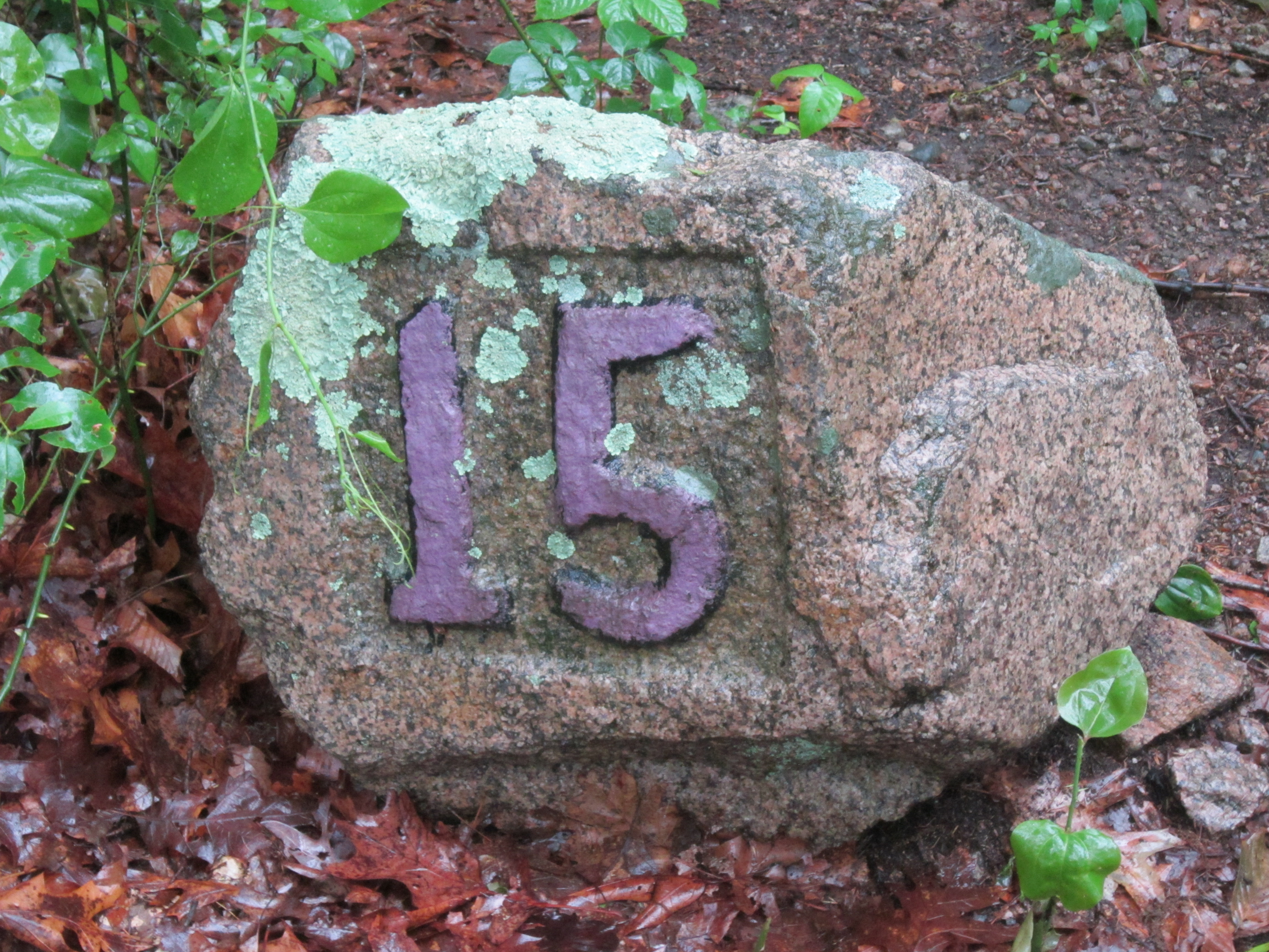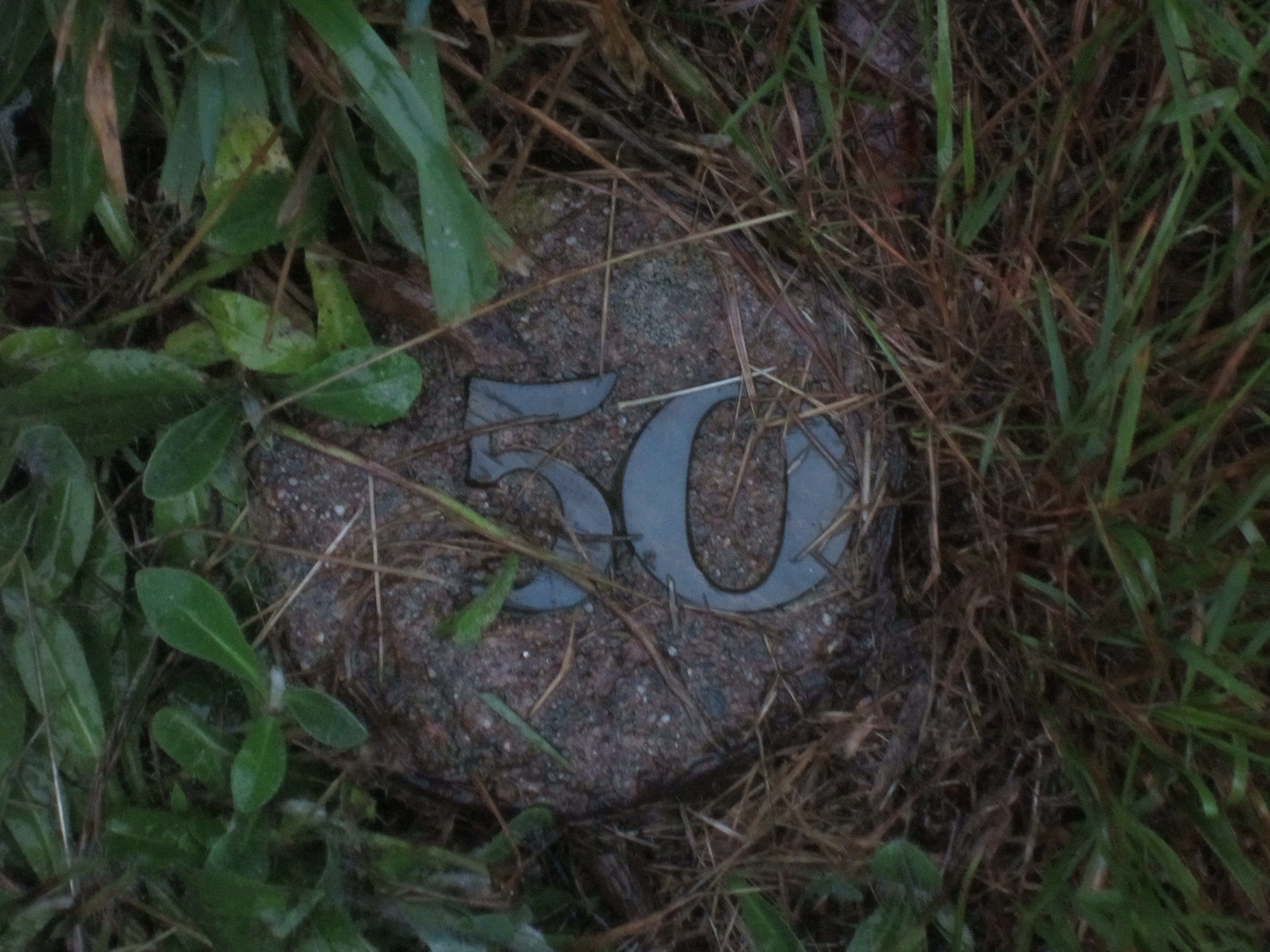 D was looking down the path at me, feeling more soaked by the second. If we were going to be standing in the rain for much longer we couldn’t waste any more time. My second wind kicked in like a jolt of electricity to my system. I pushed myself into the large clearing just beyond the grass lined path and spied an opening straight ahead of our position. A large rock with writing on it was barely discernible in the poor light. On this rock words declaring our arrival at the cemetery were faintly readable. We had made it. No time to dawdle. I knew our visit would be short, but there was a great satisfaction in finally reaching our goal. The weather hadn’t been able to stop us. The graves alternated between having names, and simply having numbers where a proper stone hadn’t yet been placed. Out of over 1,000 burials rumored to have taken place on the property, only 200 have been identified for certain. There are three memorial stones in the center that name as many people as could be discovered, but there are a lot of blank spaces at the end. I took what pictures I could, but many were blurry or too dark. Some day, when the light shines through the trees on the fields below, I will return. But at that moment we knew the adventure had reached its conclusion. As D sprinted back down the path, I took one last look before turning and racing into the darkness.